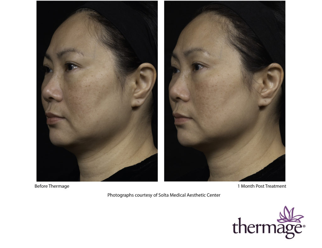 Thermage uses radiofrequency technology to heat the deep, collagen rich layers of your skin. The heat helps tighten existing collagen and stimulate the formation of new collagen, which reduces sagging, renews contours, and improves the smoothness and texture of the skin’s surface. Visible results may be immediate, and they may appear over time in the course of your body’s natural collagen rebuilding process. For most patients, measurable tightening and contouring appear gradually in the two to six months following a single treatment session. Results can last years depend on your skin condition and aging process.